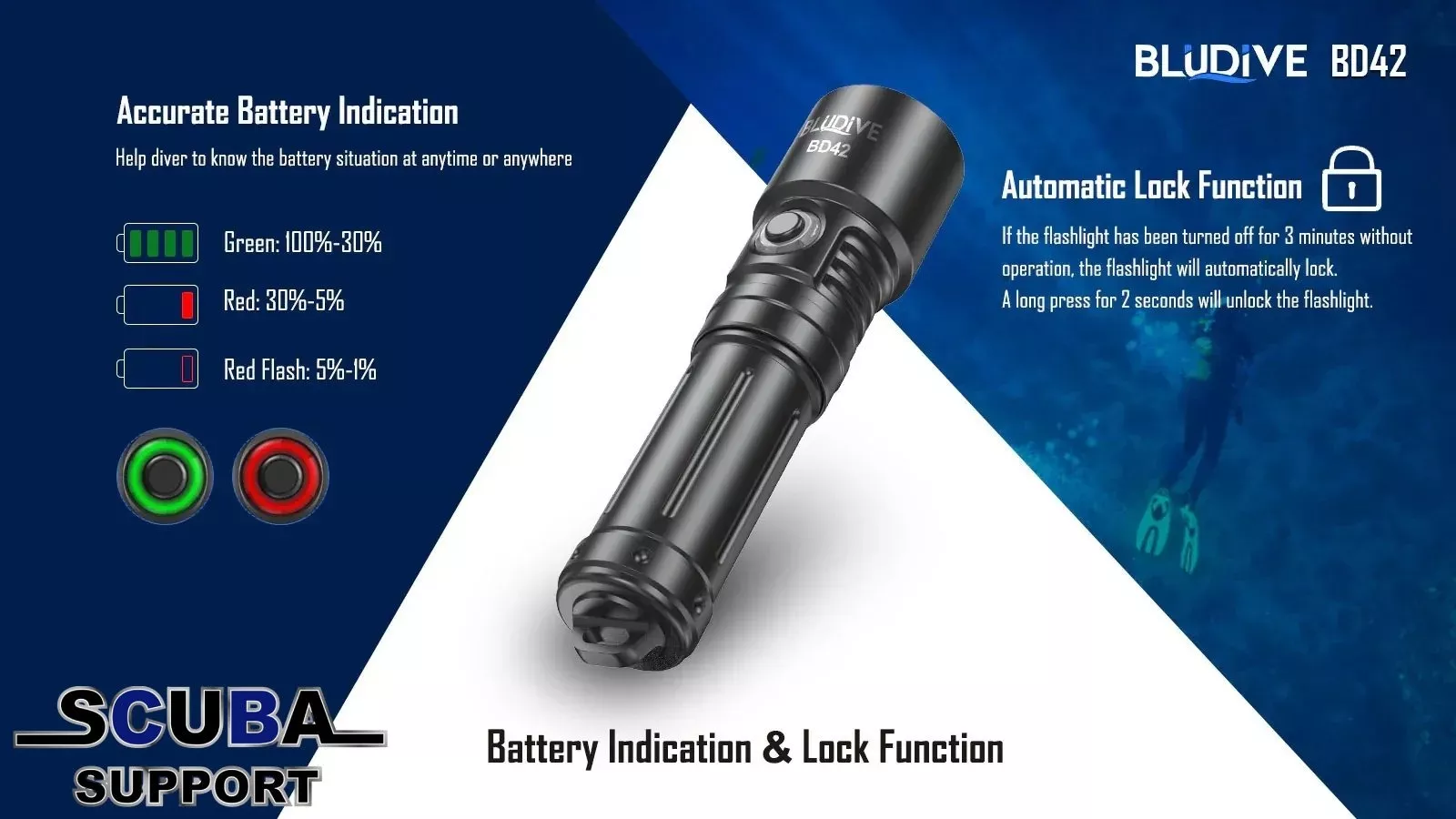 Avec sa construction robuste IPX-8 (étanche à 150 m de profondeur), sa forme compacte et sa finition anodisée dure de type III de haute qualité, la BD42 est une excellente lampe de plongée principale et une lampe de secours tout aussi fiable pour les plongées profondes ou professionnelles.