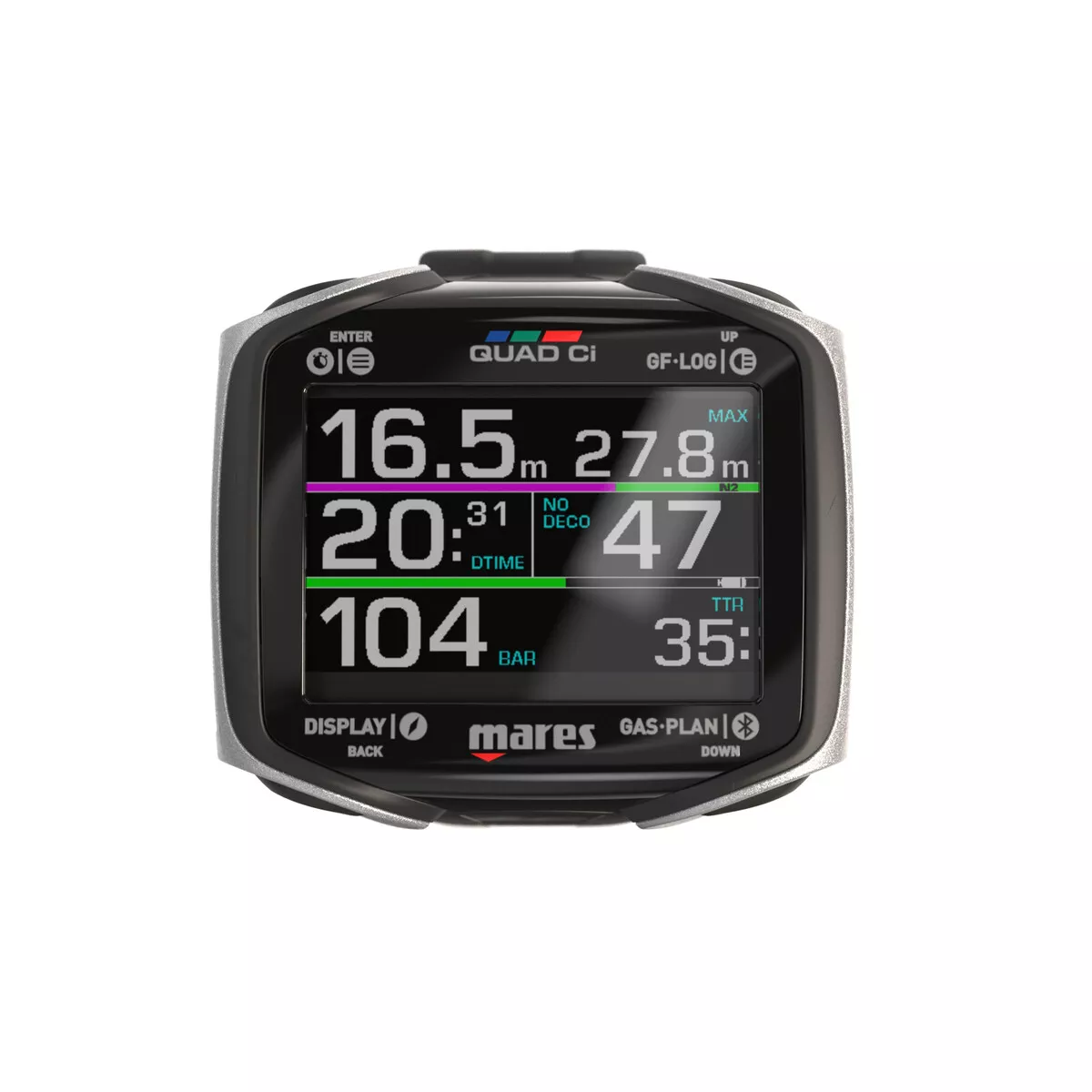 Mit dem fortschrittlichen QUAD Ci Tauchcomputer, basierend auf dem Bühlmann ZH-L16C Algorithmus, können Sie jeden Tauchgang individuell an Ihre Bedürfnisse anpassen. Das brillante 8-Farben-MIP-Display liefert Ihnen umfassende Informationen auf einen Blick und führt Sie nahtlos durch vielseitige Tauchmodi, von Luft über Nitrox bis hin zu Trimix. Der integrierte digitale Kompass sorgt für Sicherheit in Bewegung, während die Integration von Tubeless-Tankdaten und Echtzeit-Tauchinformationen die Überwachung verbessert. Mit einer Logbuchkapazität von 100 Stunden, intelligentem Batteriemanagement und benutzerfreundlicher Bluetooth-Konnektivität ist der Mares Quad CI Tauchcomputer Ihr zuverlässiger Partner für die Erkundung der Unterwasserwelt und bietet Ihnen maximale Leistung bei jedem Tauchgang.