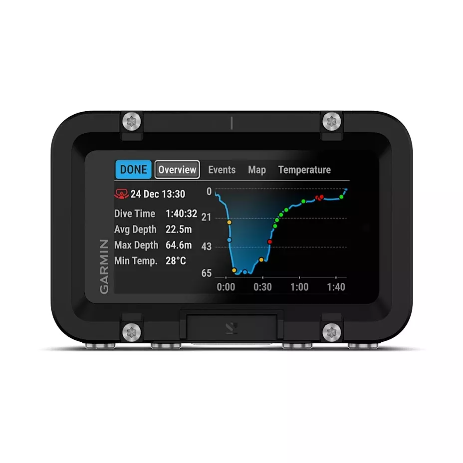 Le grand écran couleur affiche plus de données et facilite la lecture des informations importantes comme le profil de plongée projeté pour la remontée et la carte des profondeurs. De plus, l'écran tactile facilite l'utilisation à la surface1.