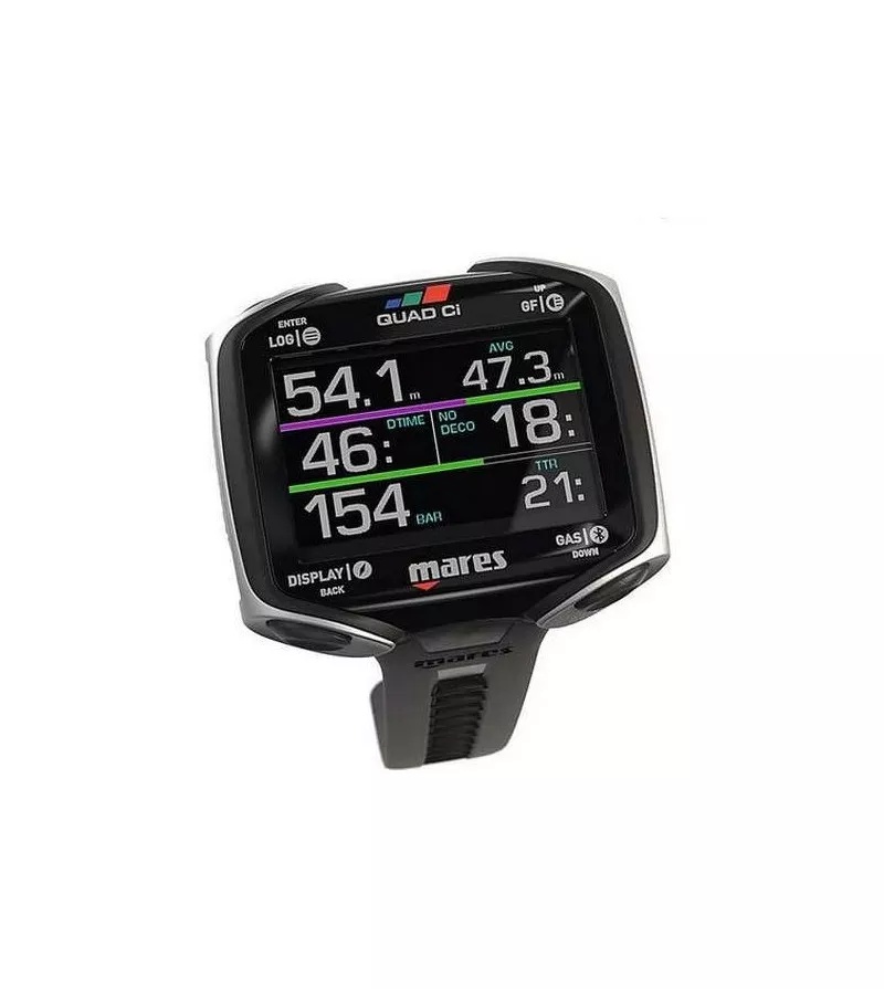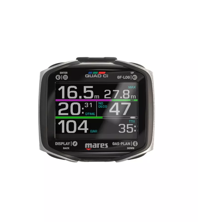 L'ordinateur de plongée avancé QUAD Ci, alimenté par l'algorithme Bühlmann ZH-L16C, vous permet d'adapter chaque plongée à vos besoins. L'écran MIP vibrant à 8 couleurs fournit des informations complètes en un coup d'oil et vous guide de manière transparente à travers les modes de plongée polyvalents, de l'Air au Nitrox en passant par Trimix. La boussole numérique intégrée vous permet de naviguer en toute sécurité, tandis que l'intégration des données du réservoir tubeless et des informations de plongée en temps réel améliore la surveillance. Avec une capacité de journal de bord de 100 heures, une gestion intelligente de la batterie et une connexion Bluetooth conviviale, l'ordinateur de plongée Mares Quad CI est votre partenaire fiable pour explorer le monde sous-marin et vous offre des performances maximales à chaque plongée.