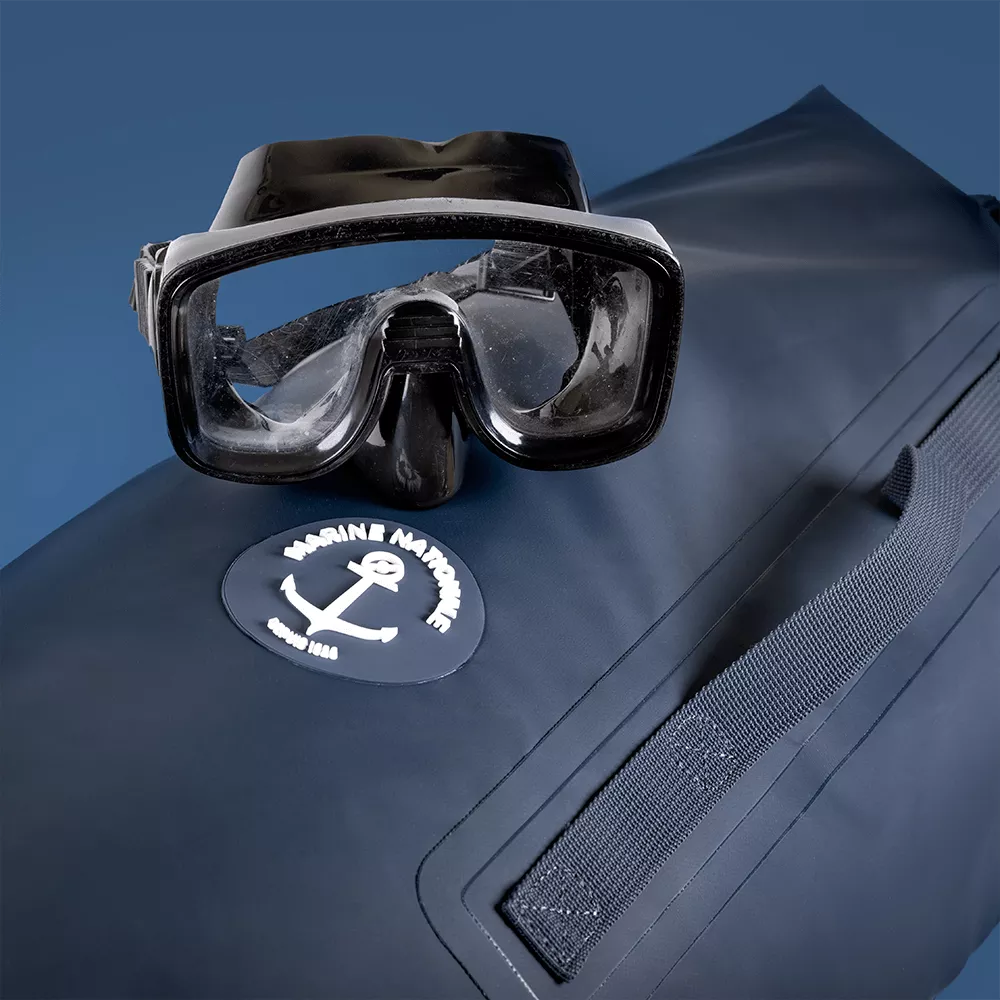 Composé d'un compartiment principal et d'une poche intérieure zippée, le sac étanche Verseau est équipé de bretelles ergonomiques griffées d'un drapeau français. Élégant avec ses inserts ton sur ton, ce sac est personnalisé du logo de la marque Marine nationale en PVC blanc sur la face avant.