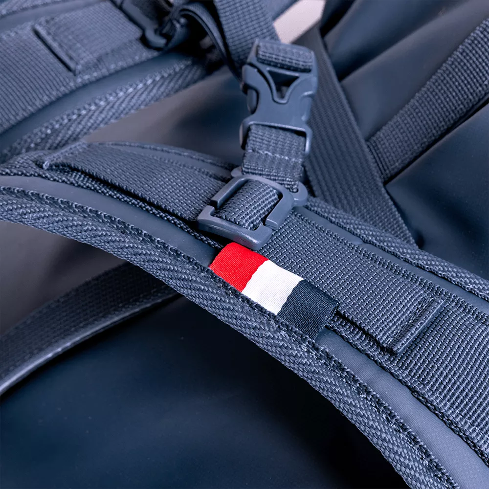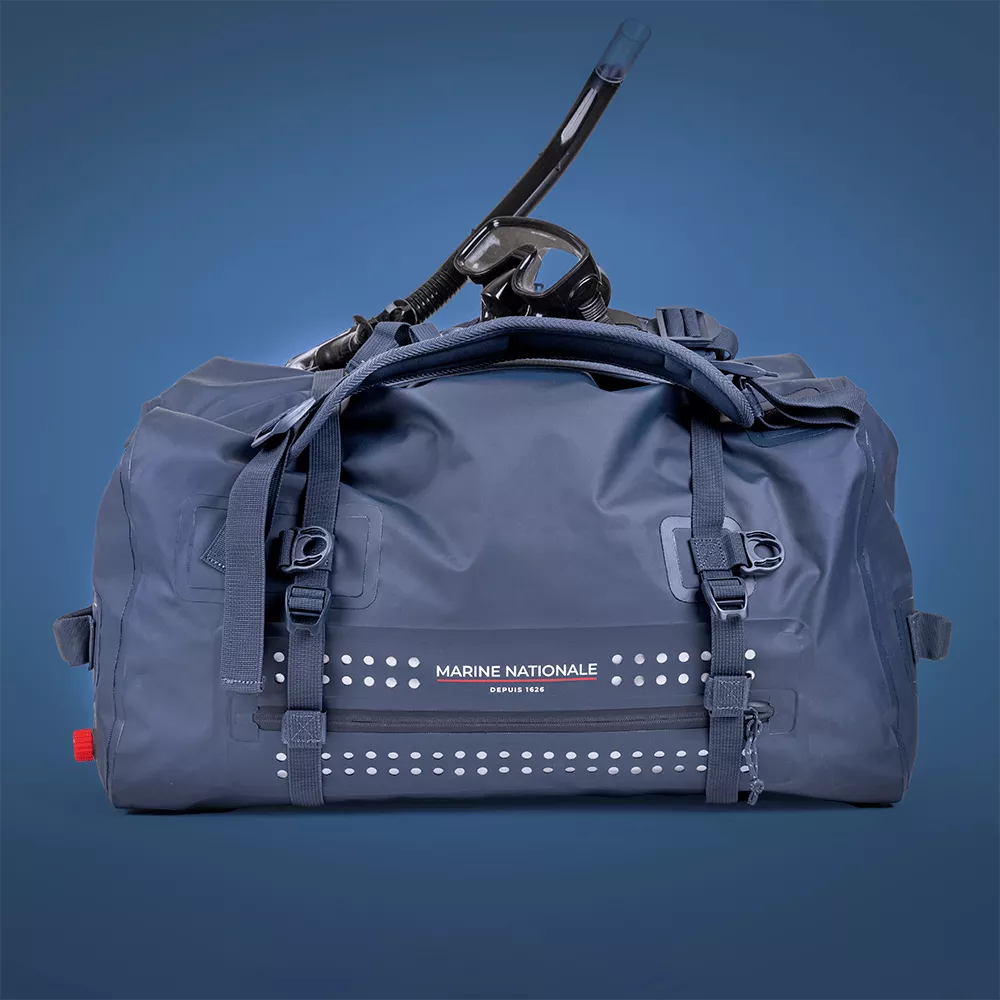 Griffé du logo MN, diminutif de « Marine nationale », sous la forme d'un patch PVC blanc sur une face et de la mention « Marine nationale depuis 1626 » sur l'autre face, le sac étanche Eridan est également équipé de bretelles ergonomiques rembourrées pour un réel confort de portage.
